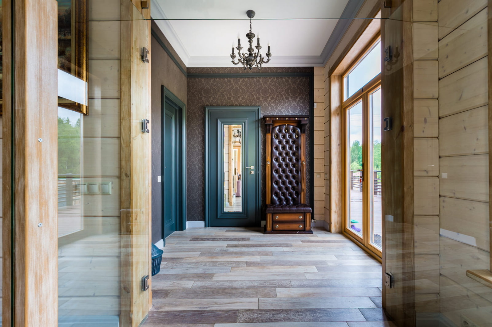 تُظهر الصورة غرفة معيشة صغيرة في منزل خشبي ، مزينة بثريات سقف وشمعدانات جدارية.