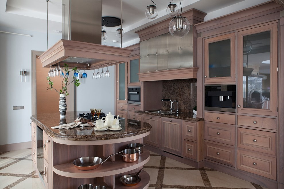 В класическата кухня за производството на островния модул се използват скъпи дървета в комбинация с декоративни позлатени детайли. Плотът на масата е изработен от камък или мрамор с благородна текстура. Бордюрният камък е голяма неподвижна конструкция във формата на правоъгълник със заоблени ъгли.