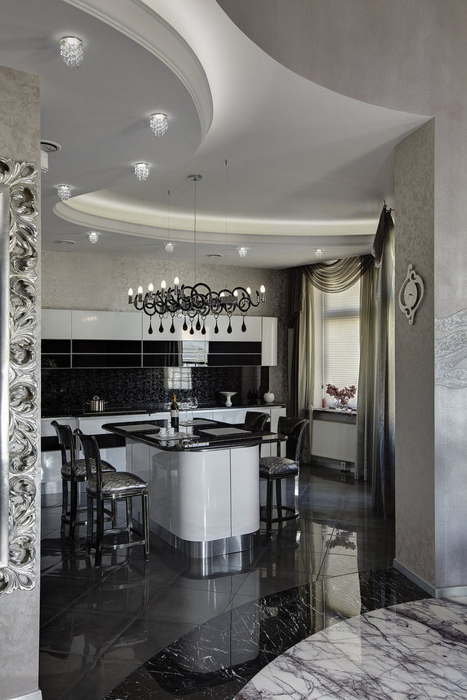 - Кухня-хол. С помощта на двустепенни капки е възможно да се подчертаят отделни функционални зони на кухнята-хол и визуално да се раздели пространството.