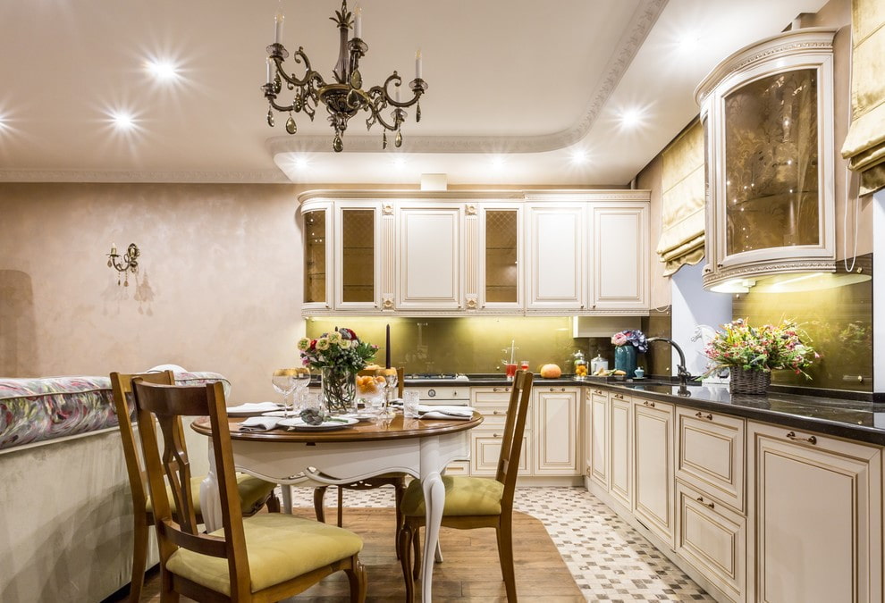 Снимката показва класическа кухня и ъглова таванна конструкция на две нива, поставена над кухненския комплект.
