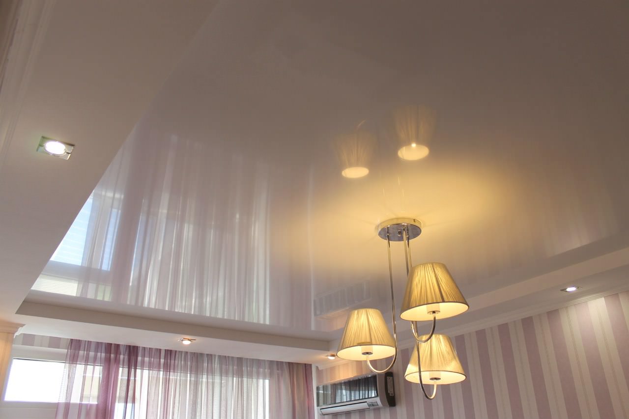 Може би това е най-подходящият вариант, тъй като лъскавите повърхности са най-лесни за поддръжка, лесно се измиват, не абсорбират мазнини и мръсотия и не ги задържат на повърхността. Блясъкът отразява светлината, която приближава повърхността на такъв таван до огледалните свойства. Увеличава осветеността, кухнята изглежда по-просторна.