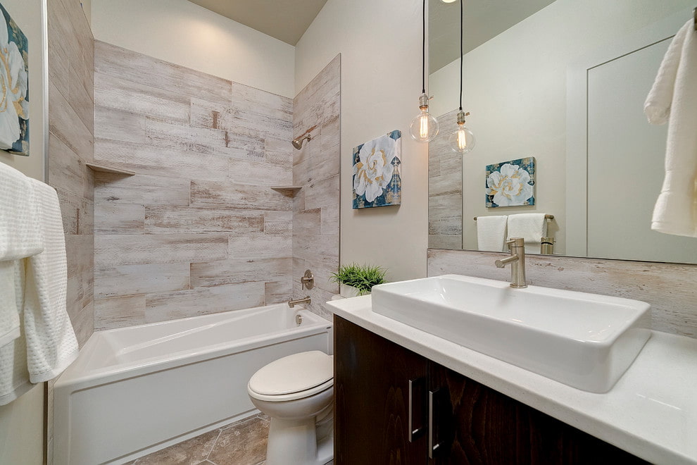 На снимката има баня със светли плочки с имитация на състарено дърво на стената.