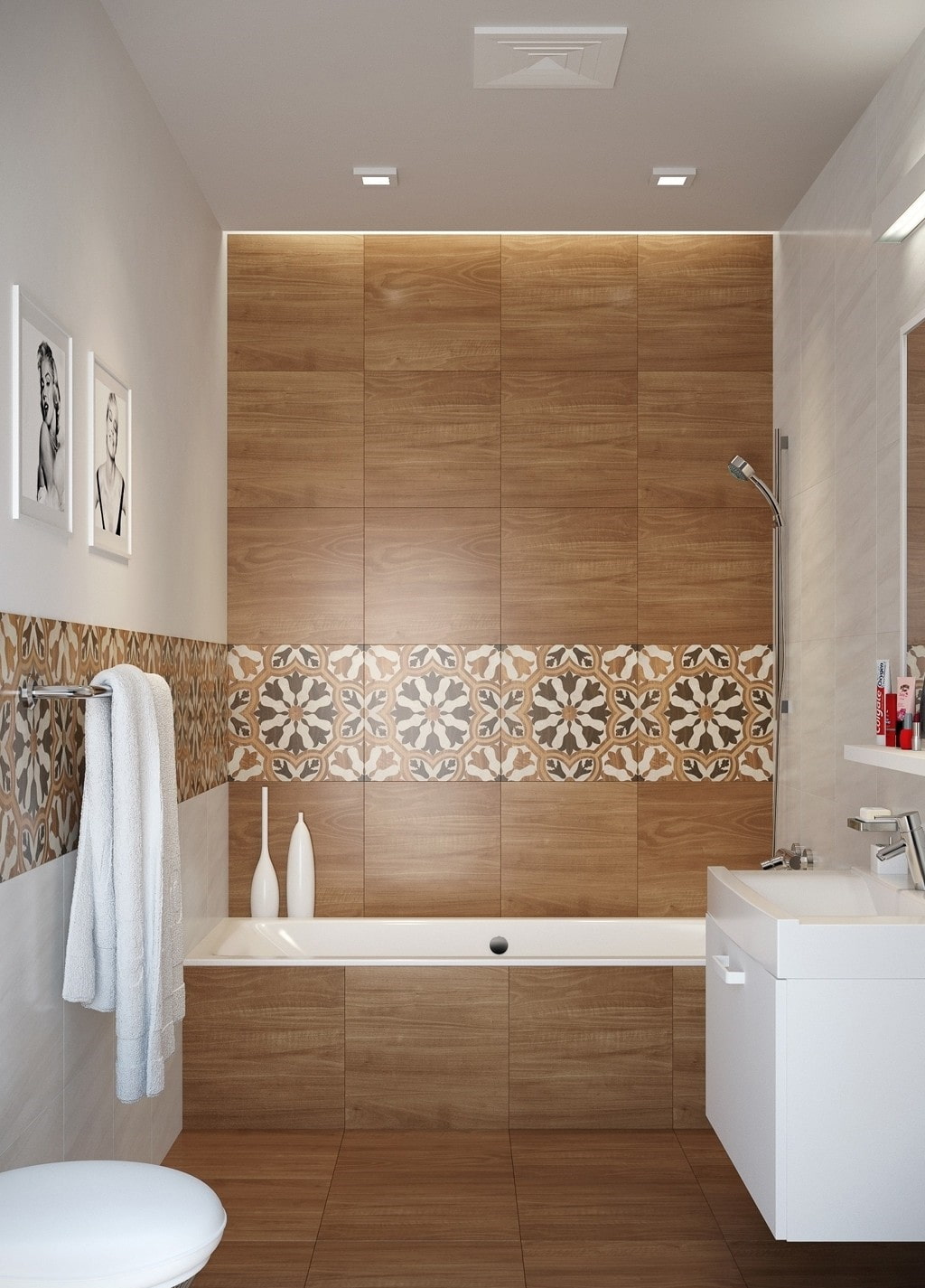 На снимката има баня със стена, облицована с плочки, подобни на дърво.
