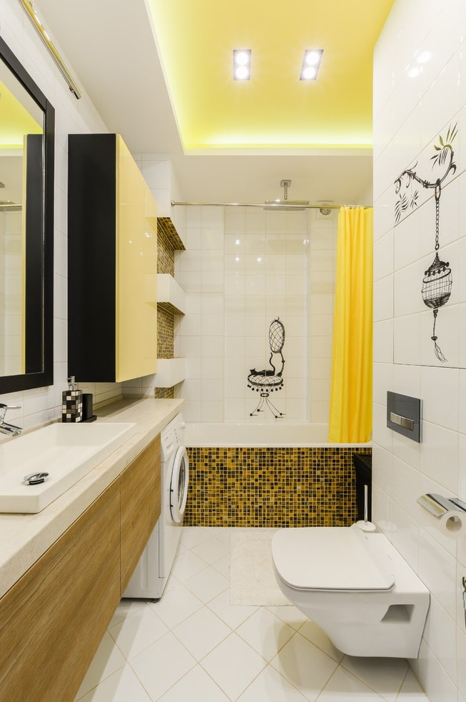 В зависимост от вида на таванната повърхност дизайнът на банята придобива по-изтънчен вид.