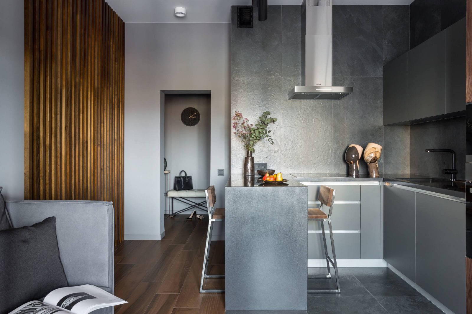 На снимката има място за спане в ниша, отделено от общата всекидневна с наситено черно.