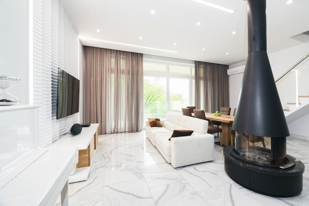 In einem schneeweißen Wohnzimmer im klassischen Stil sind die Wände mit schönen Gemälden verziert, die Fenster mit dicken Vorhängen verziert und der Raum ist mit luxuriösen braunen oder grau-schwarzen Möbeln ausgestattet. Ein Kamin mit weißem Ziegel- oder Marmorfinish verleiht der Atmosphäre eine Art Romantik.