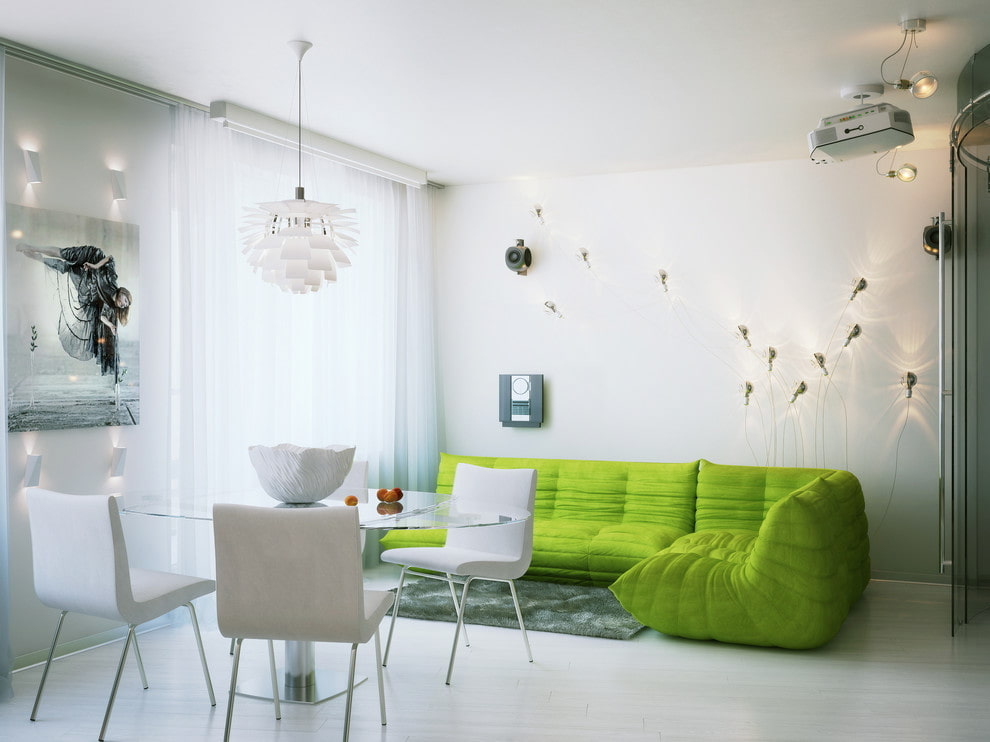 Das Foto zeigt das Interieur eines modernen Wohnzimmers in schneeweißen Farben mit Akzentelementen in Grün.