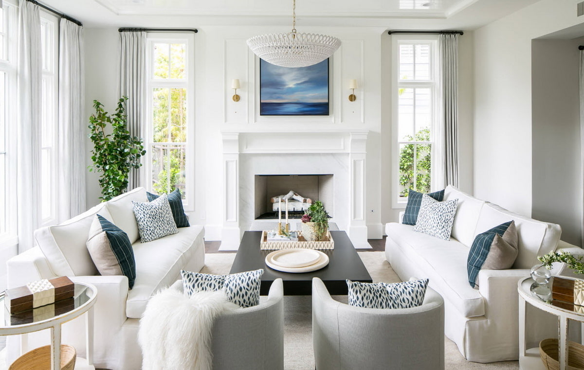 Das Foto zeigt ein weiß-beiges Wohnzimmer im provenzalischen Stil.