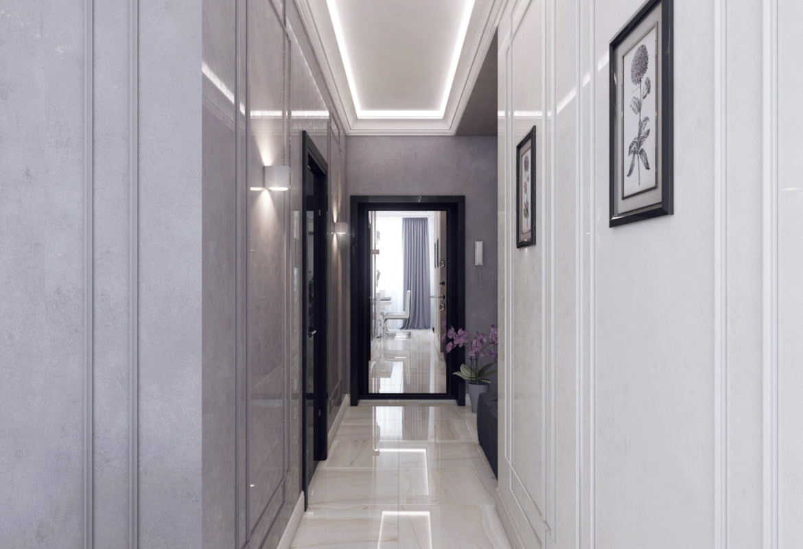 Die Eingangshalle wird mit einem LED-Deckenband sowie Wandleuchten beleuchtet. In der Nähe des Ankleidezimmers befindet sich ein niedriger rechteckiger Sitzpuff, der mit Kutschenpolstern verziert ist - Sie können darauf sitzen, um Schuhe zu wechseln oder eine Tasche und Handschuhe darauf zu legen.