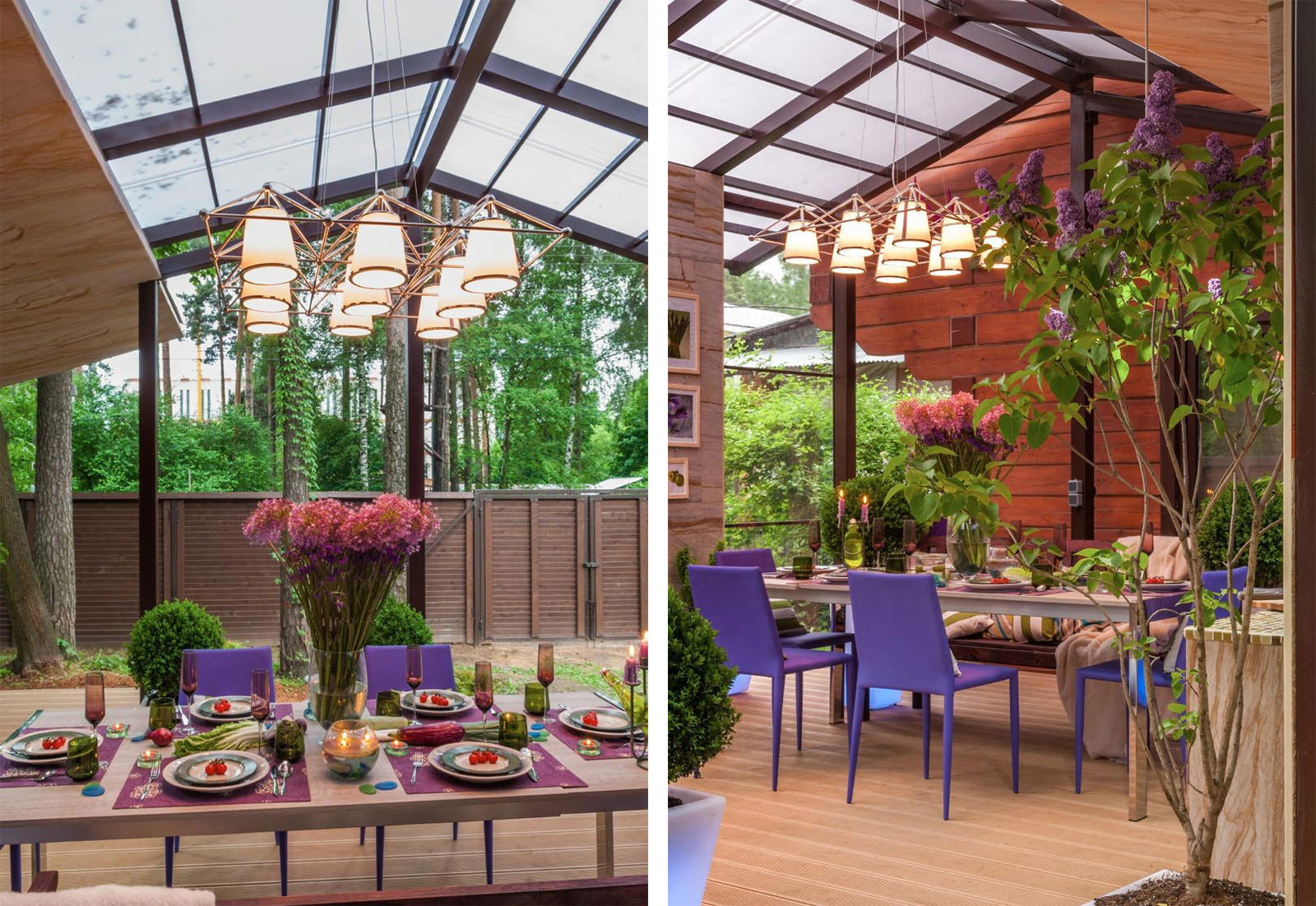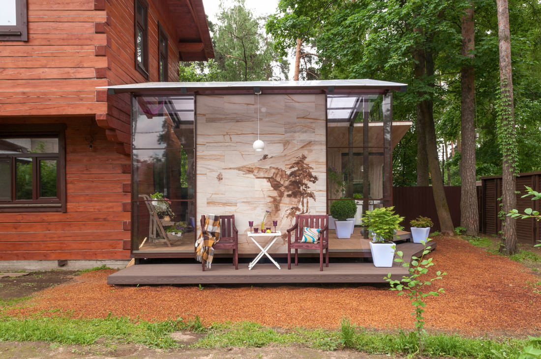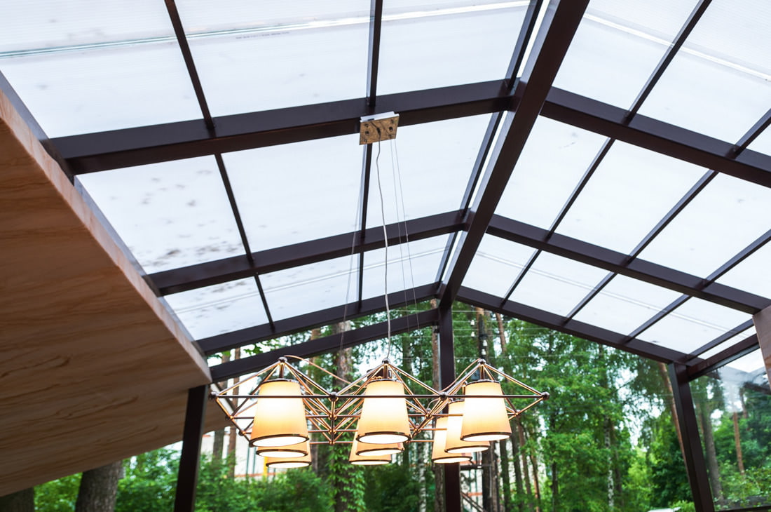 Das Terrassendesign ist einfach und streng, aber es ist elegante Schlichtheit. Das Dach des Anbaus im Bereich des Esstisches ist transparent, aus witterungs- und stoßfestem Polycarbonat in Wabenstruktur. In der Nähe der Wand, an der sich der Arbeitsbereich „Küche“ befindet, besteht der Dachabschnitt aus Metallziegeln.