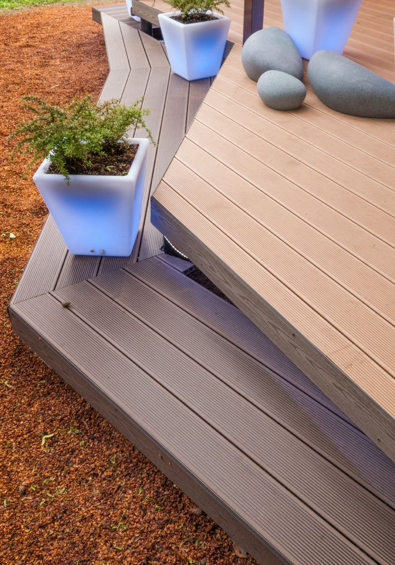 Der Boden ist mit einer speziellen Terrassendiele bedeckt, die auf Aluminiumbalken verlegt ist. Einige wurden in ihrer natürlichen Farbe belassen, andere haben einen "gealterten" Look.