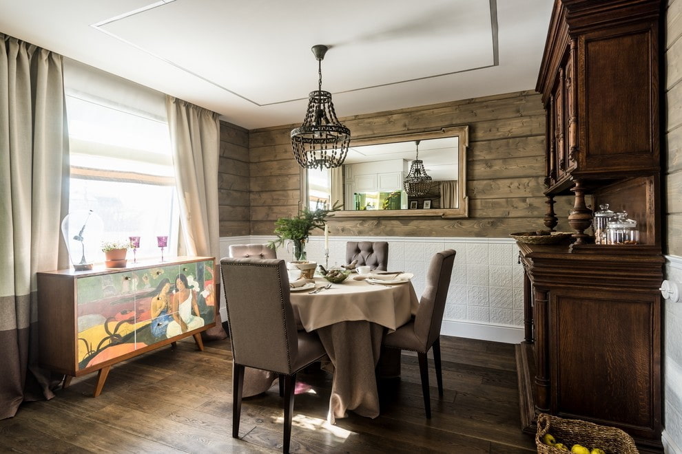 Η φωτογραφία δείχνει το σχεδιασμό της τραπεζαρίας, σε ρουστίκ στιλ.