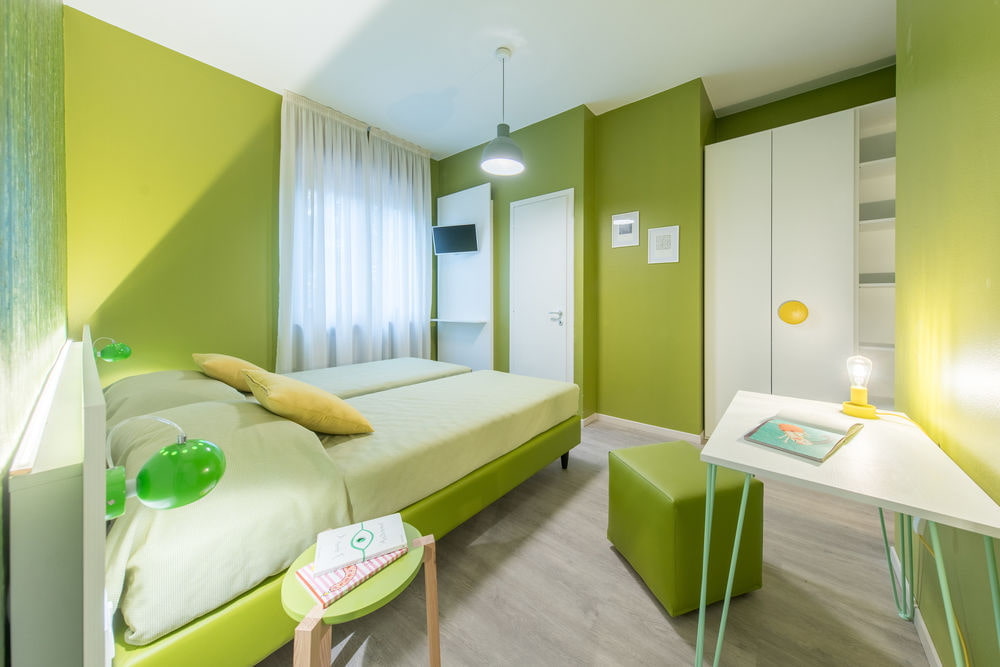 Η φωτογραφία δείχνει το εσωτερικό ενός μοντέρνου υπνοδωματίου, φτιαγμένο με ανοιχτό πράσινο χρώμα.