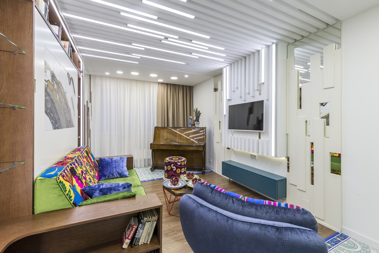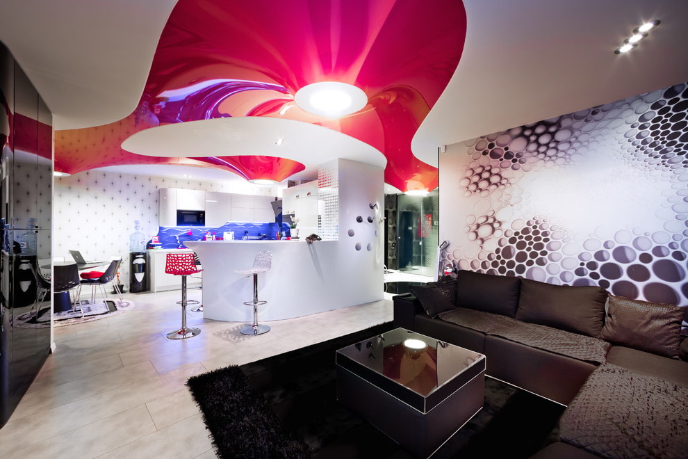 On the picture original interior of the kitchen-living room. The ceiling combines two finishes, a classic flat surface and bright glossy tapered inserts.