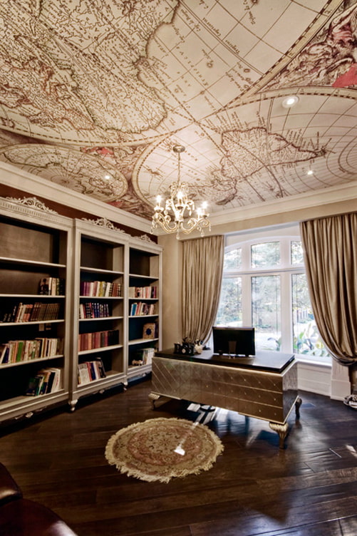 Another original home decoration option. Wallpaper can have unusual relief or image, for example, a map of the world on the entire surface of the ceiling, imitation of snakeskin, or multi-colored fragments.