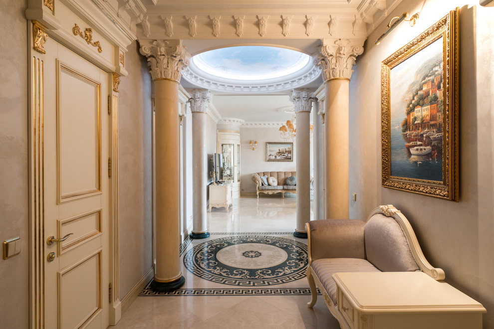 In a classic interior, the main decoration will be a wooden coffered ceiling or decor in the form of stucco and stained glass inserts.