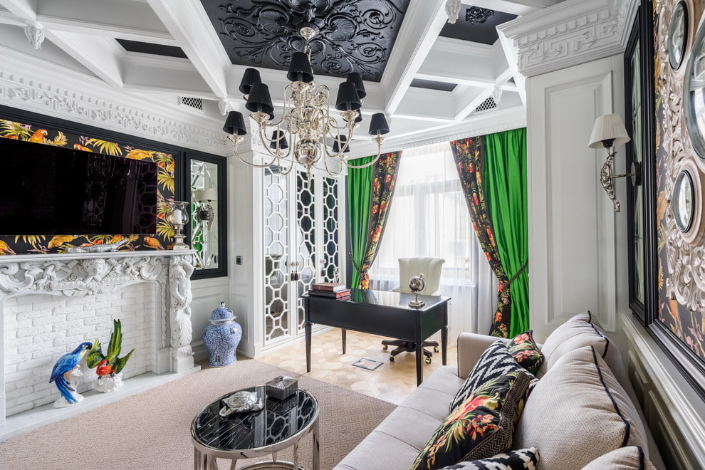 On the picture the spacious living room is divided into zones with a figured ceiling and chandeliers.