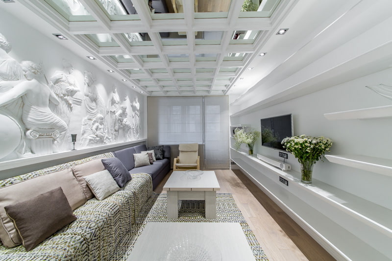 The living room or hall gives more opportunities for the embodiment of fantasies. A ceiling of a complex shape, panels and inserts from various materials, as well as volumetric images will be appropriate. The size and color of the structure should be chosen depending on the height of the ceilings and the area of the room.