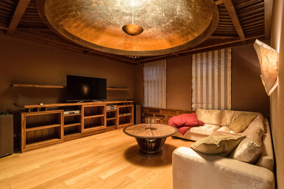 The LED strip hidden in the tiers and decorative panels creates the feeling of a floating ceiling and makes it taller.