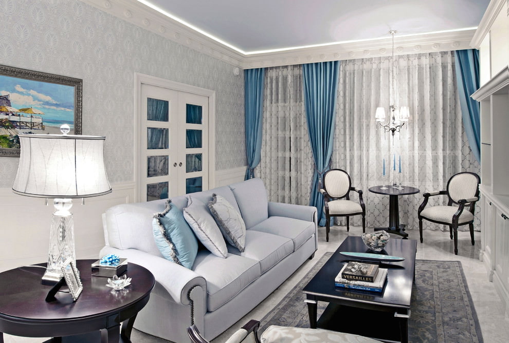 On the picture the ceiling in the living room is decorated with a tension structure with a glossy surface.