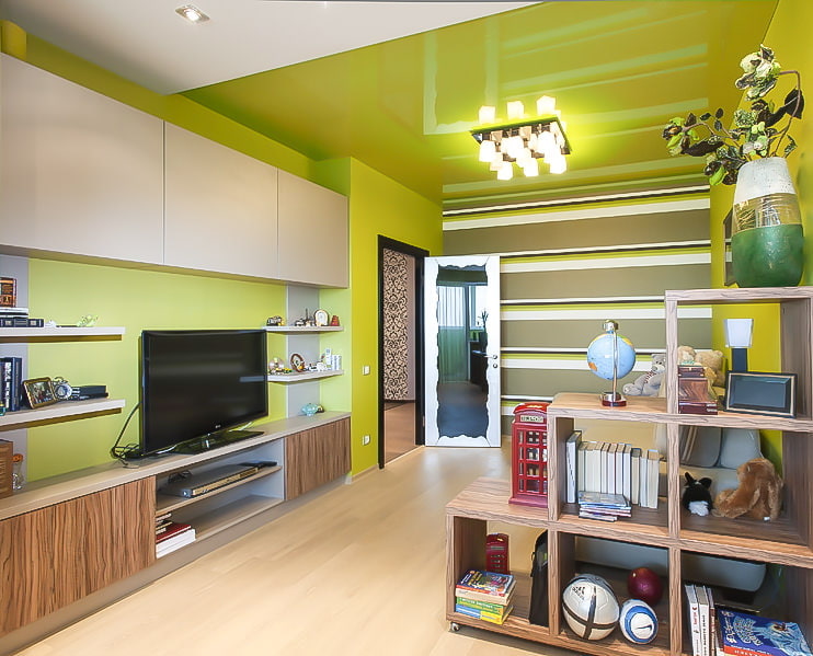 Another common way to increase space is a stretch ceiling with a glossy surface.