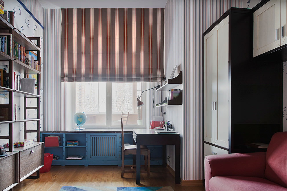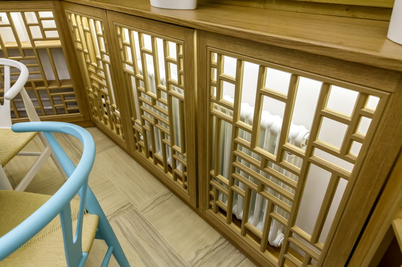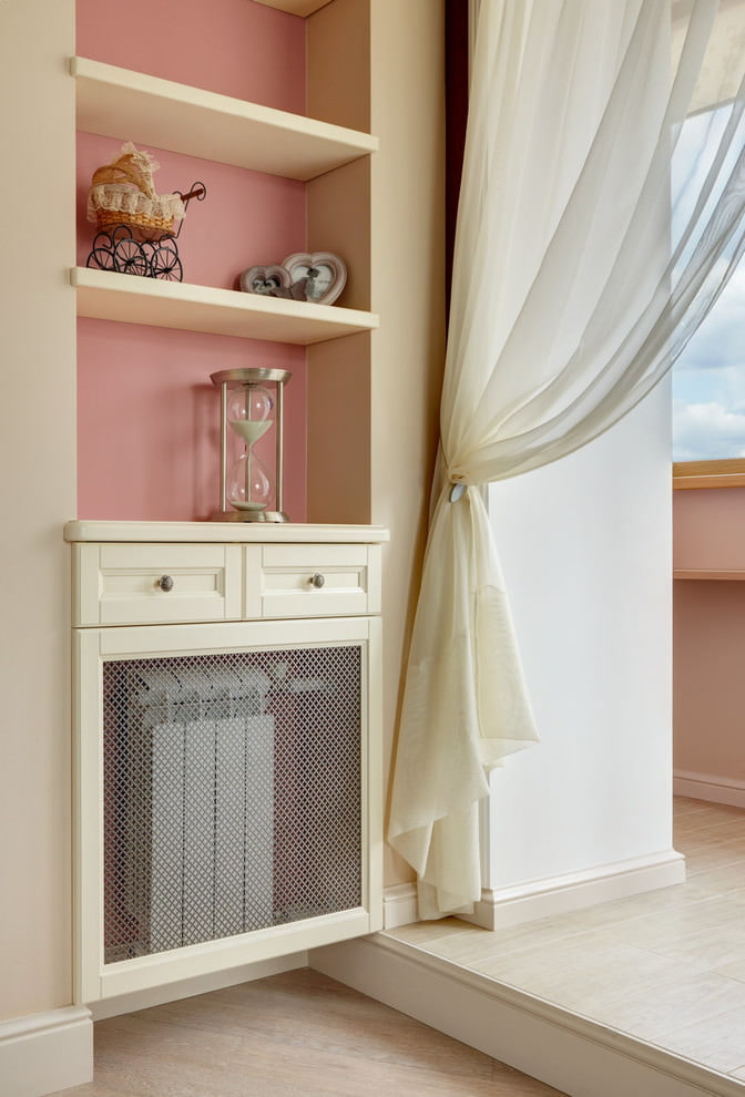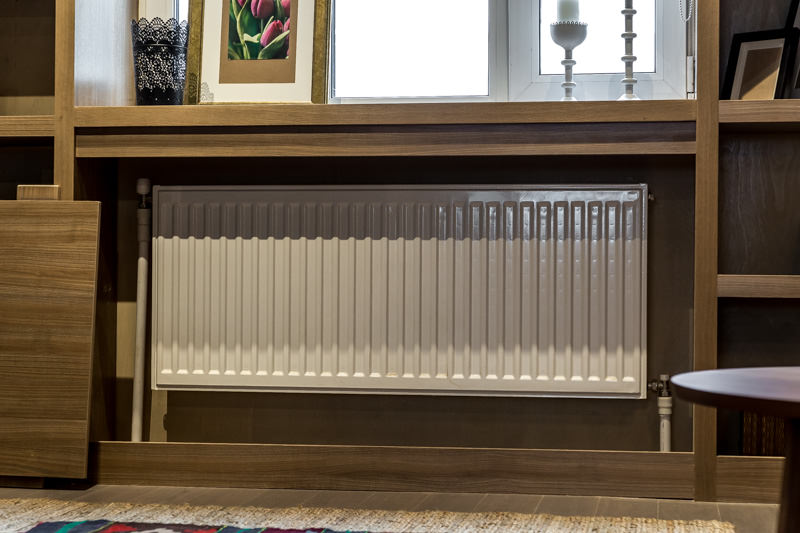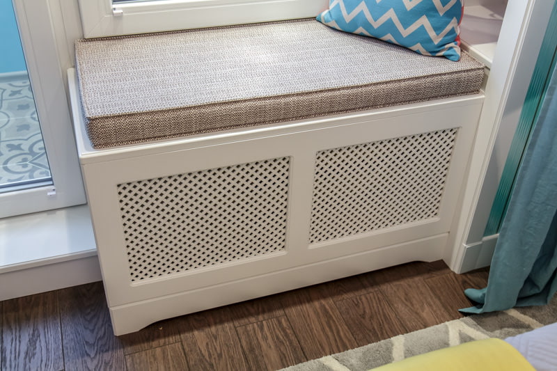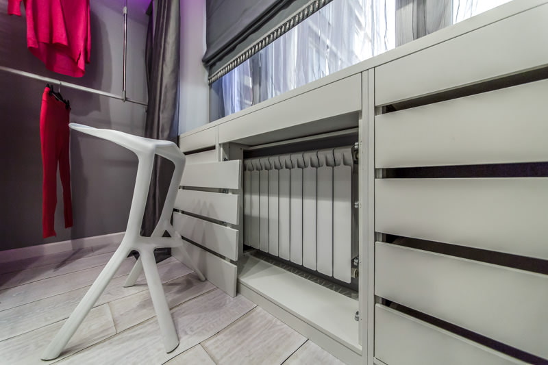 Another common way to close the radiator is custom-made furniture or built-in furniture (shelves, wardrobes, folding tables, seating).