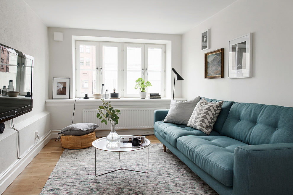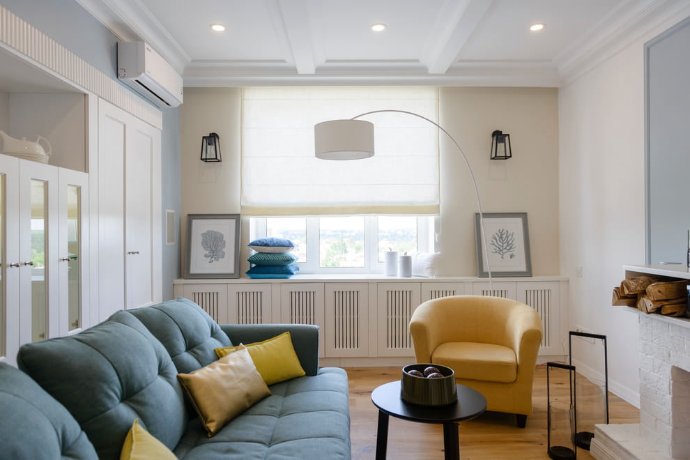 On the picture modern living room. In order to hide the radiators, a wooden structure is mounted, which also serves as a place for rest, storage and decoration.