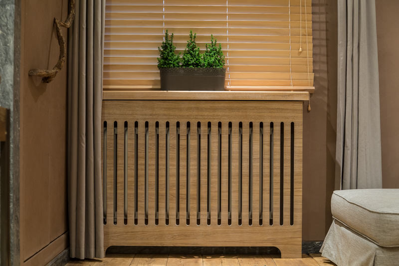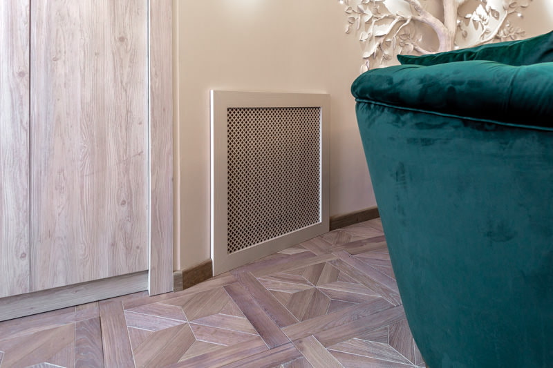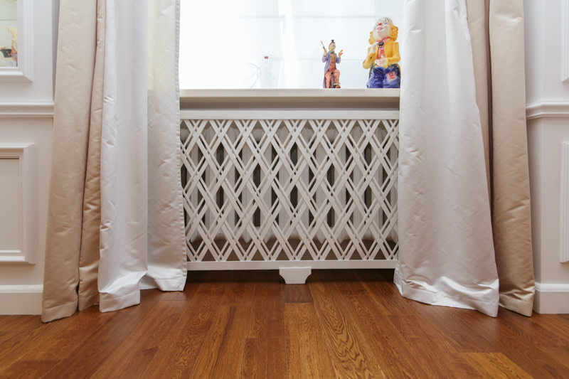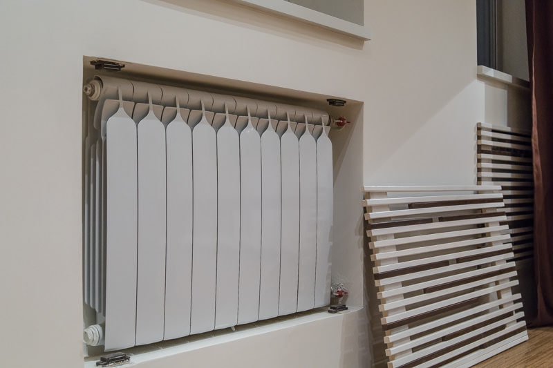 For radiators in hallways, glass screens or wooden boxes are suitable. In a small room, you only need to cover the battery from the point of view of practicality. This could be a shoe storage cabinet, or the battery becomes a small coffee table where keys and other essential items can be stored.