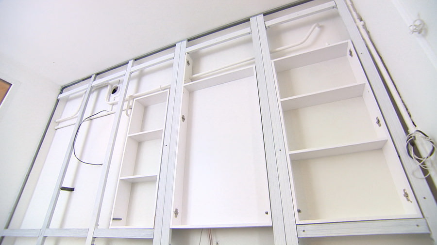 Plasterboard installation. Plasterboard sheets can be cut with a clerical knife. Screw on with a screwdriver.