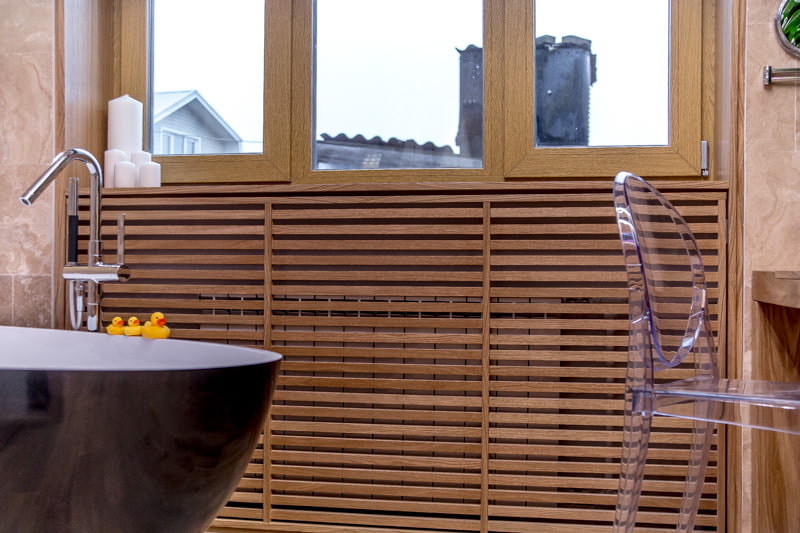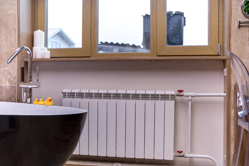 On the picture the radiators in the bathroom are hidden with a wooden box.