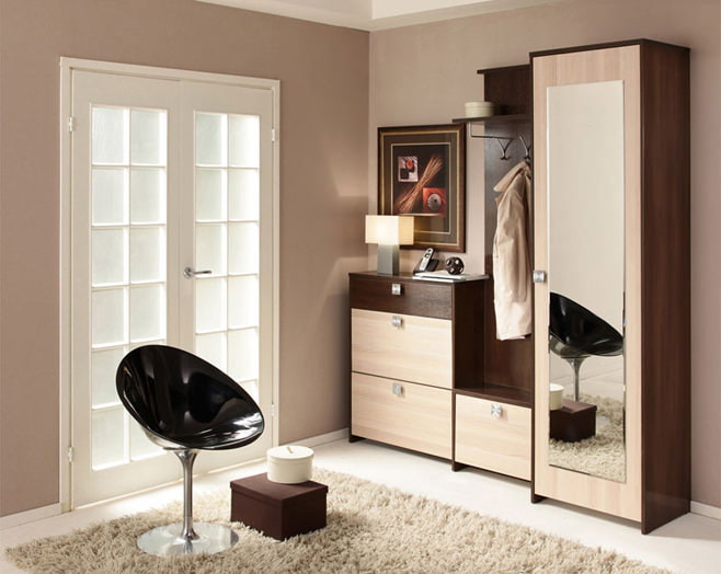Entrance areas in standard apartments are not too voluminous, therefore arrange furniture according to Feng Shui by all the rules it may not work, but the basic principles can be taken into account. The front door should not hit other doors or furniture when opened.