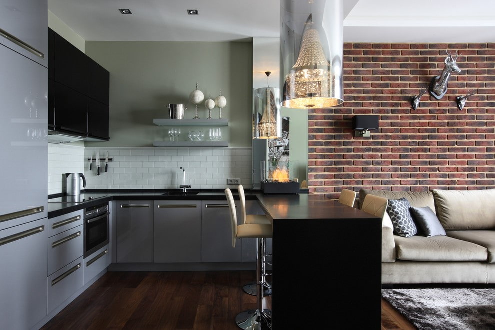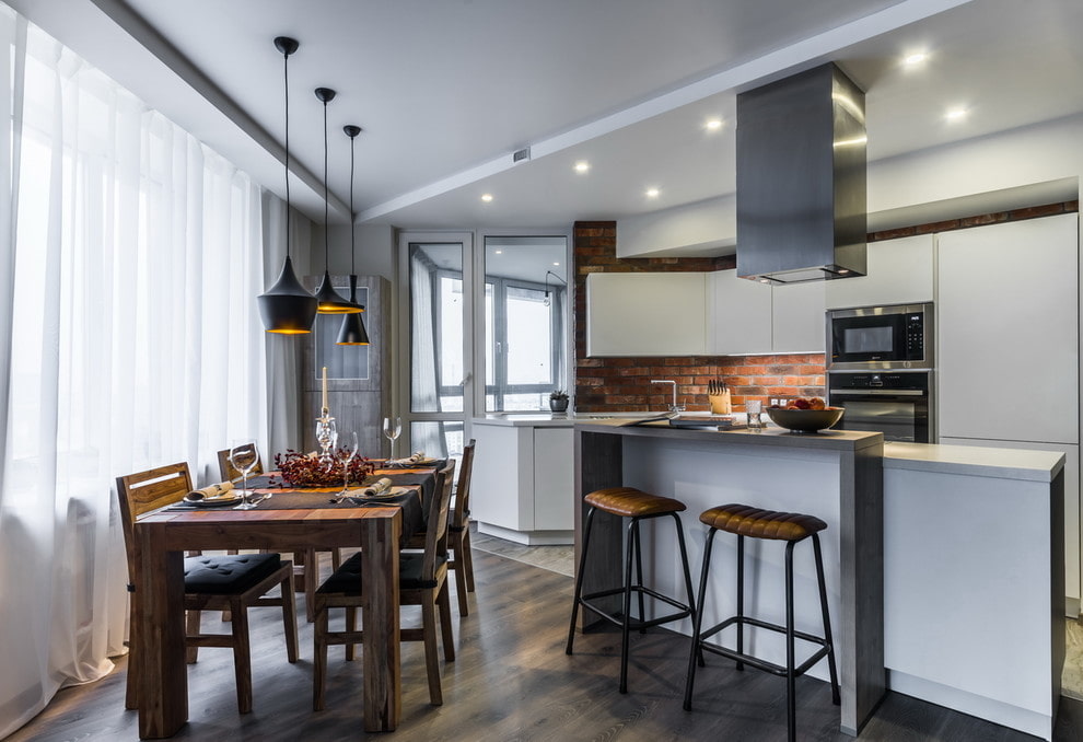 The most common zoning elements for the kitchen-living room are the dining table and sofa. If the layout does not imply the installation of such furniture, we divide the room with the help of flooring.