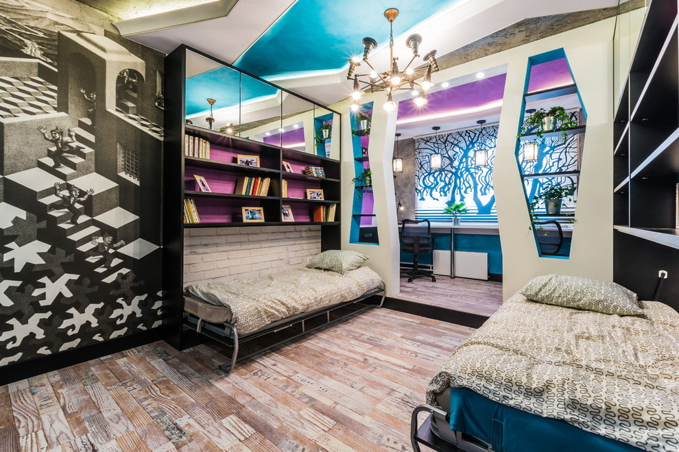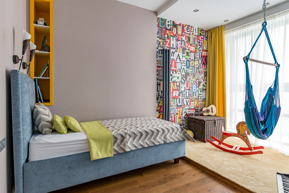 With the help of textiles, you can separate the area for playing, sleeping or studying. This zoning method endows the interior with romance and magic, so it is especially suitable for a girl's room. In a boy's bedroom, it is appropriate to differentiate with a fixed partition, transforming furniture, lighting or decoration.