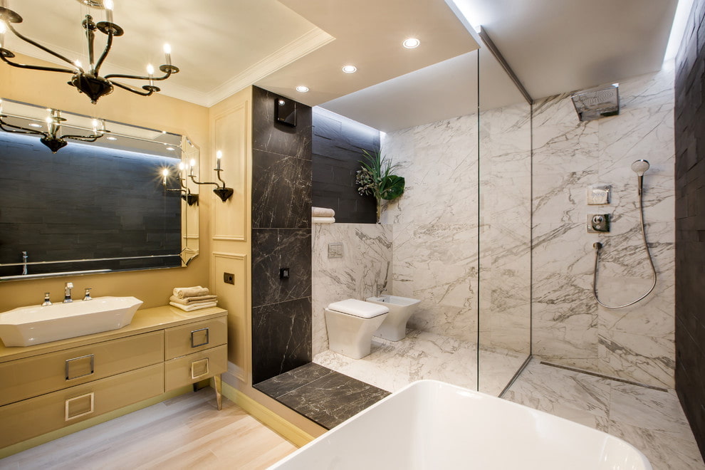 For budget repairs, color zoning is suitable. A win-win move for a bathroom will be the allocation of a site with tiles with drawings or ornaments. You can visually delimit the room with lighting. For example, equip a bright light source above the sink, and select devices with a more subdued light for the area with a bathtub and toilet.