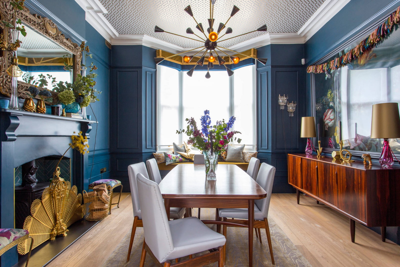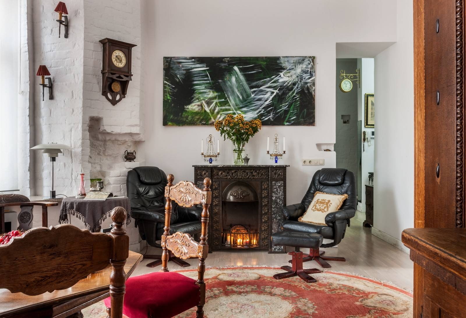 The photo shows a mix of modern, classic and retro styles. Particularly noteworthy is the black fireplace, which gives the atmosphere a mystical character.