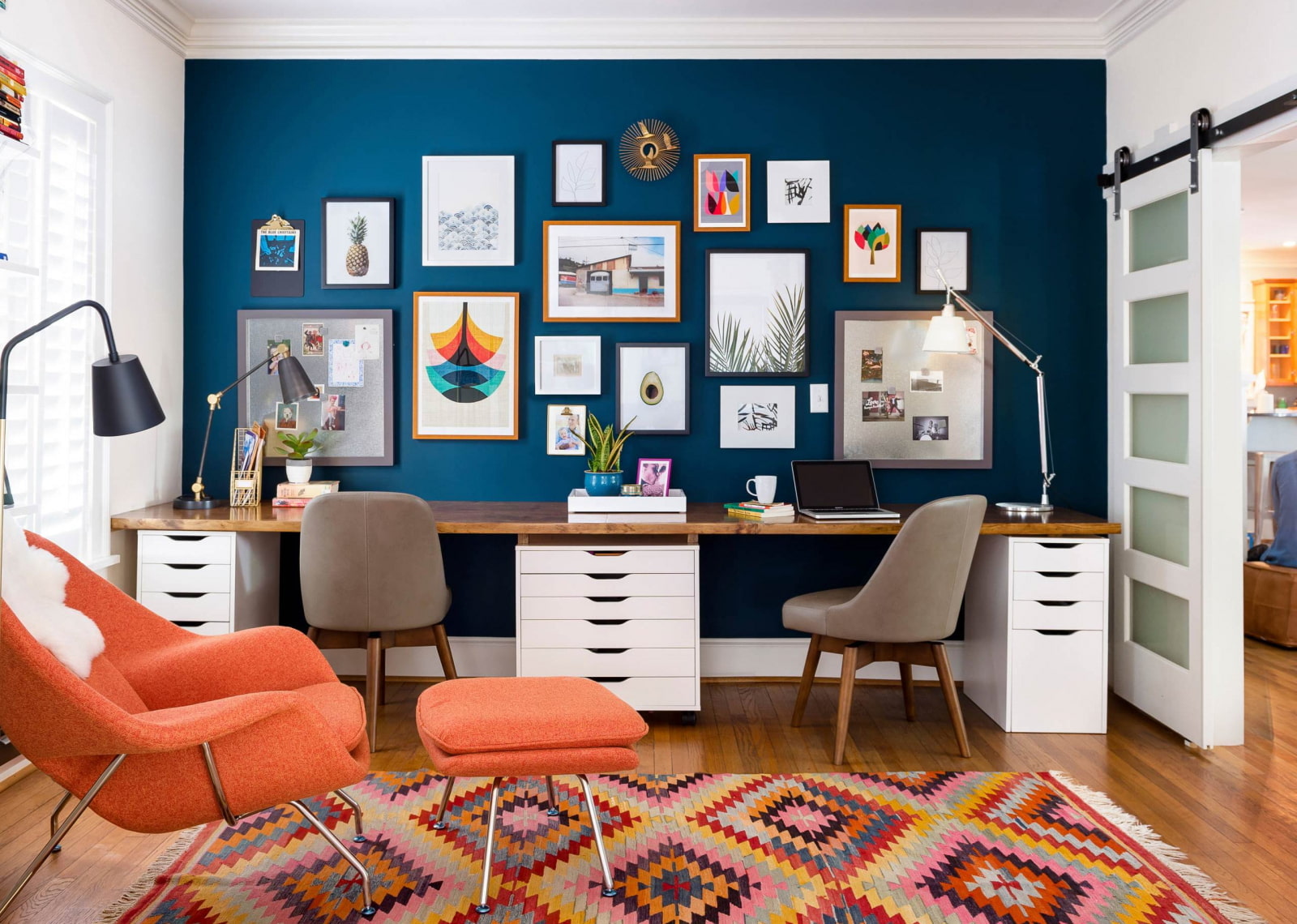 In the photo there is a shelving unit painted with the same glossy paint as the walls, as well as a multi-colored designer chest of drawers.
