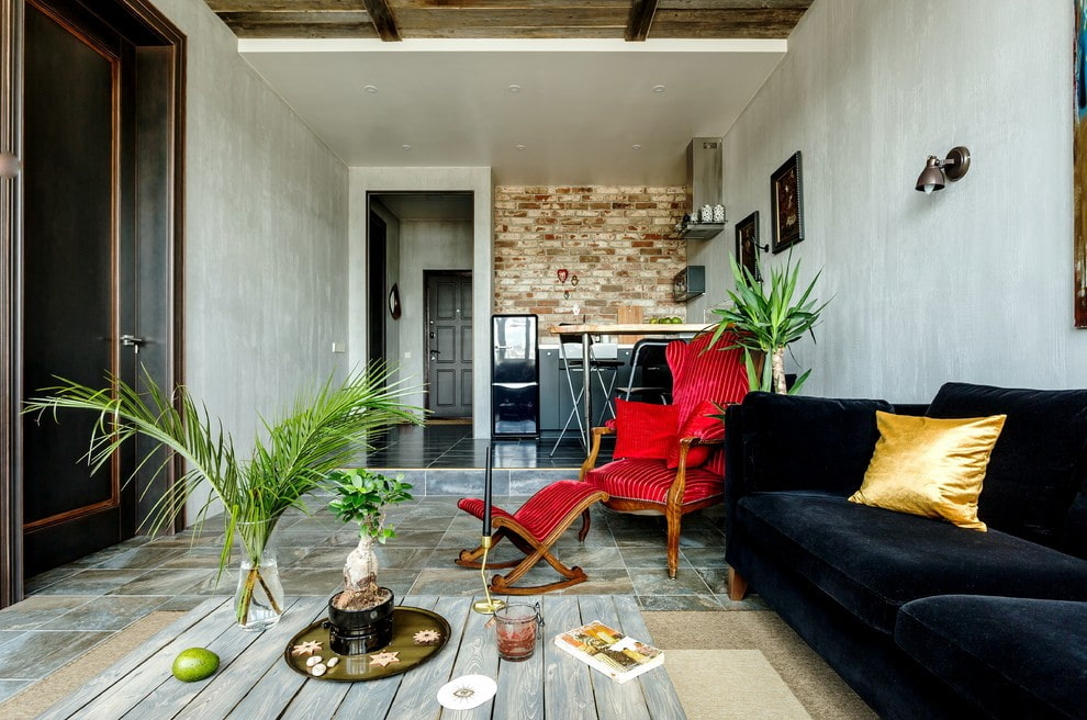 In the photo there is a fusion-style room with loft elements.
