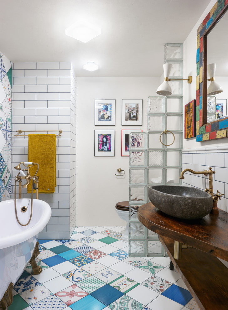 It would seem that the bathroom is not the place where you can show imagination and combine many textures. But even if the area is limited, nothing prevents you from painting one or several walls in rich colors, adding a couple of paintings, choosing a bright shower curtain and laying an original rug.