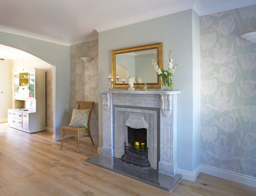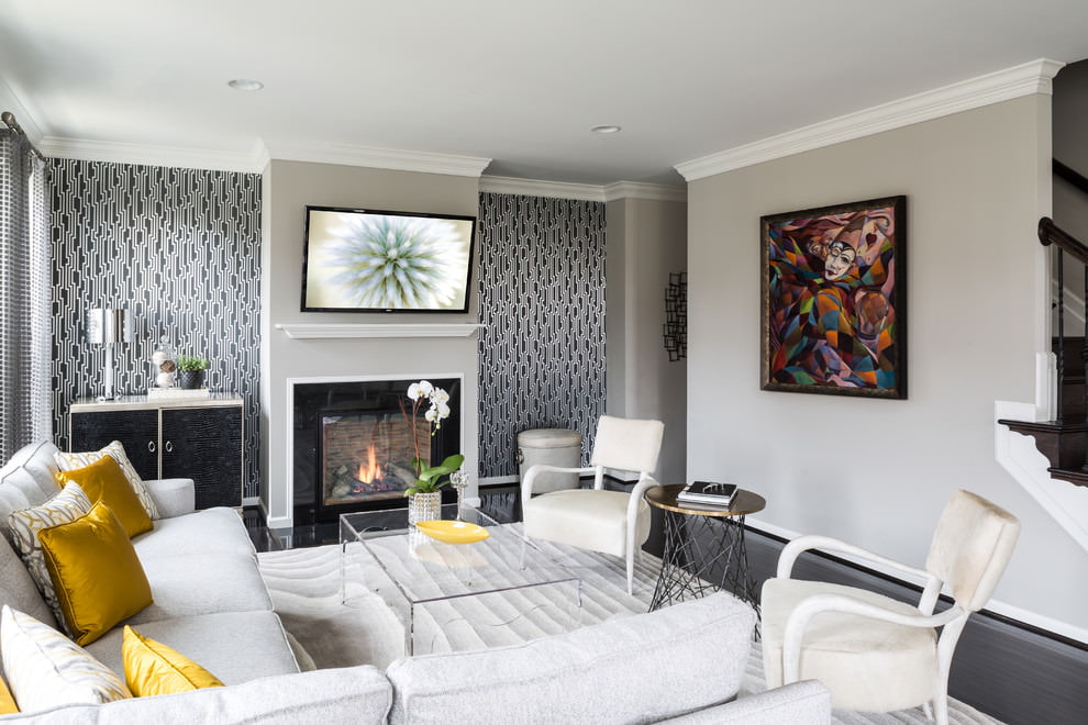 In order to highlight any area, for example, a fireplace or TV, use a background wallpaper. Part of the wall may have a solid color that differs from the main shade or be with an unusual pattern.