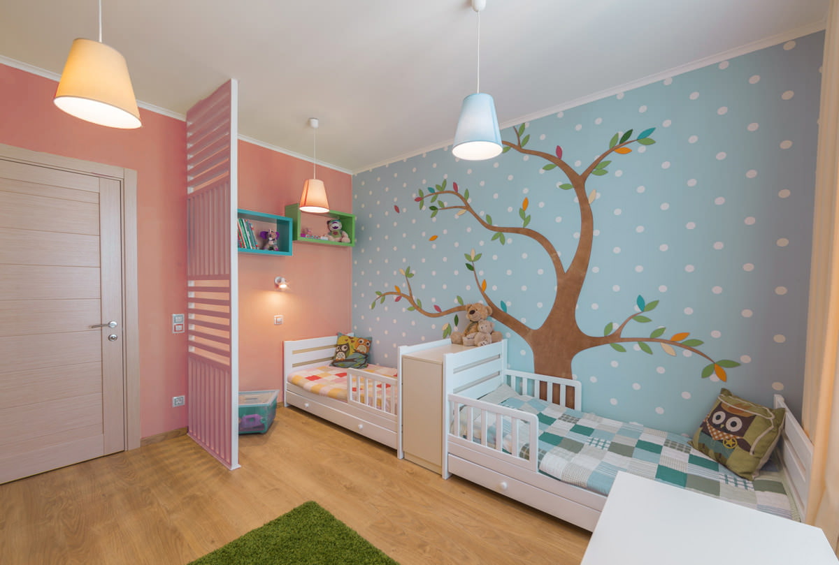 You can safely combine bright and juicy shades with the children's room. For babies, you can use the patchwork technique with colors and patterns that match the gender. One of the walls decorated with photo wallpaper or wallpaper with pictures will also look good.