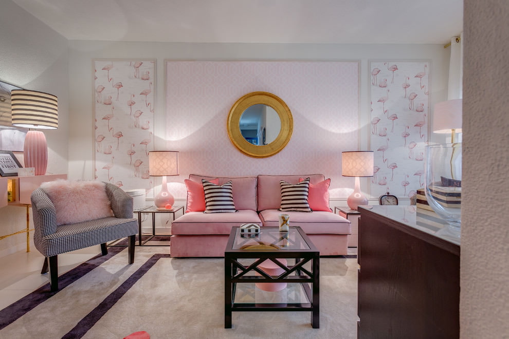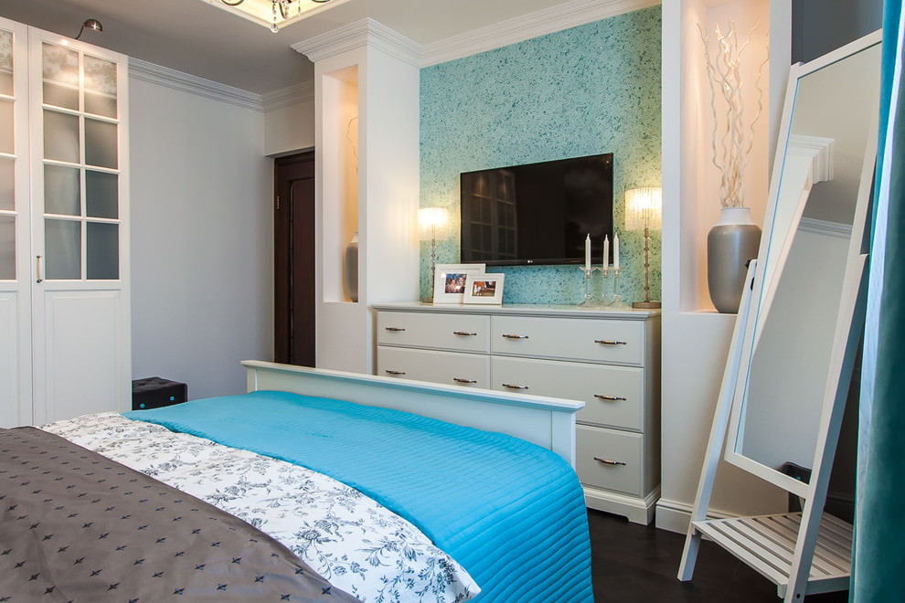 Most often, the accent wall becomes the one on which the gaze falls when entering the room. A bright shade or three-dimensional image will "move" the wall, in this way you can bring a long narrow room a little closer to the shape of a square. Depending on the stylistic direction, the main color can be similar in tonality to the accent wall or be radically different.