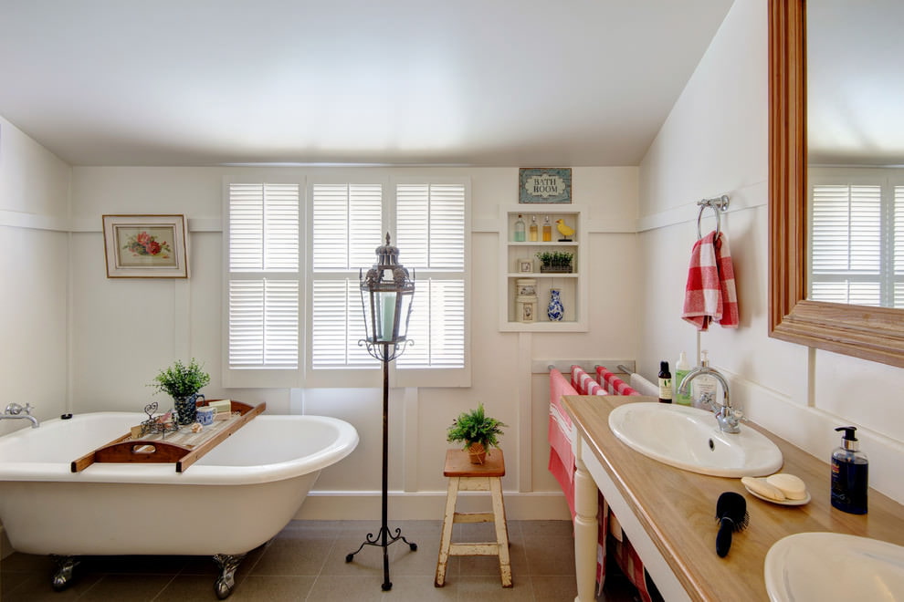 On the picture the interior of the bathroom is decorated with a lamp in the form of a lantern with a forged base.
