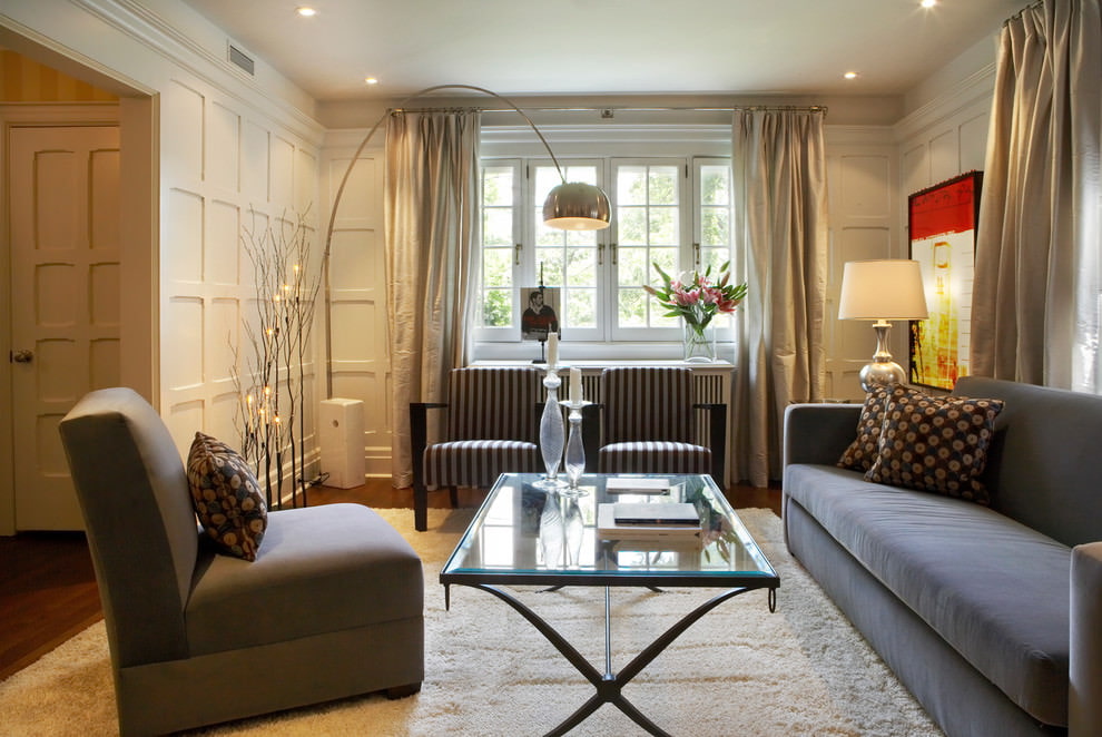 In the hall, a floor lamp is located in a recreation area, for example, near a sofa or an armchair. The lighting is bright, diffused. The design should be in harmony with the overall interior. With an unusual shape, you can divide the living room space into zones.