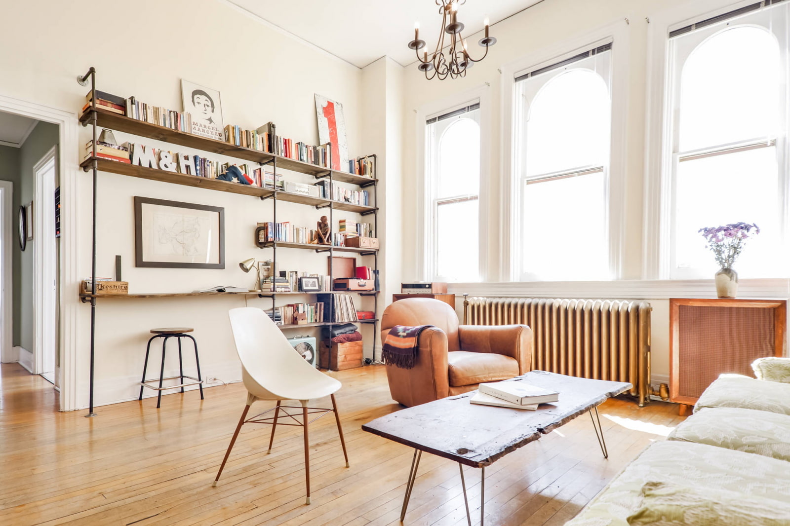 In the photo there is a loft-style living room. The white color of the walls serves as a background for the contrasting furniture, while the color of the floor emphasizes the brutality of the furnishings.