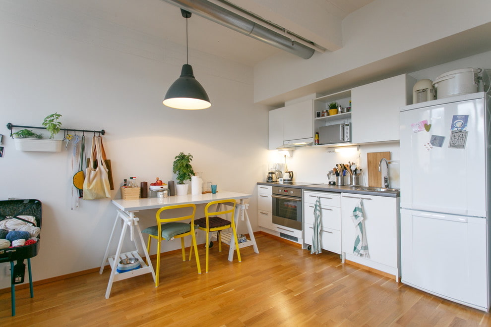 White walls are the hallmark of a Scandinavian apartment. They are supported by hand-made decor elements, budget furniture, cozy textiles and house plants.