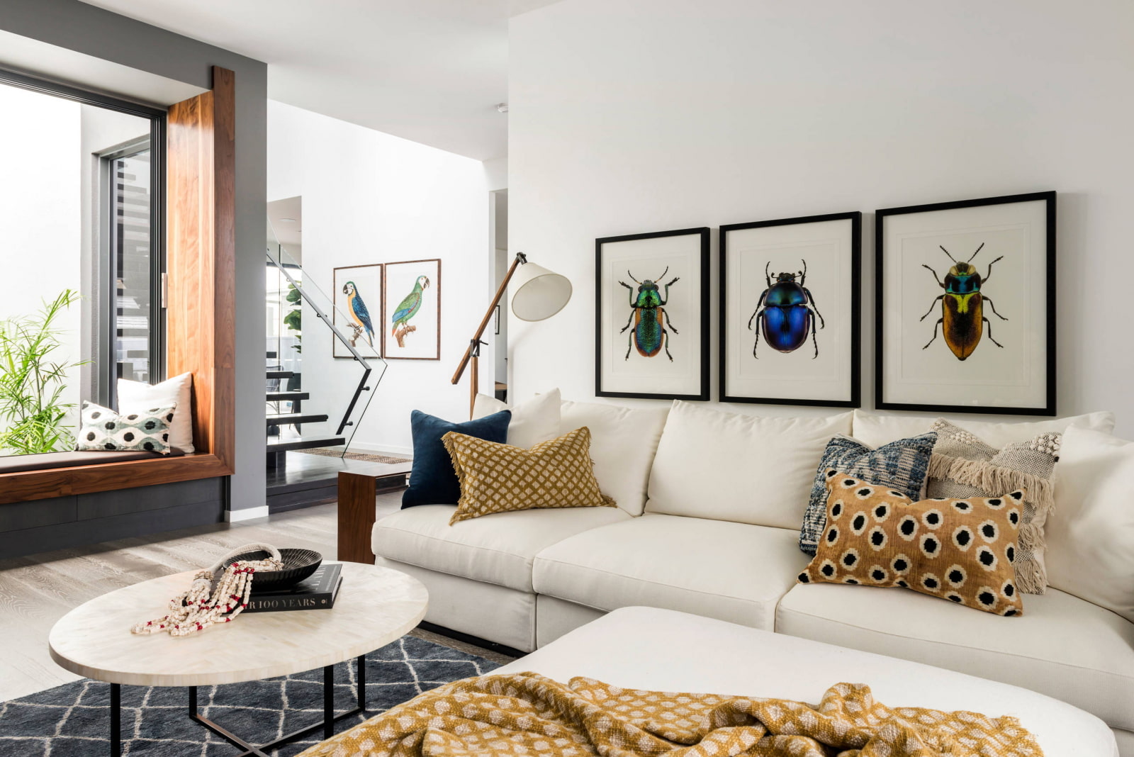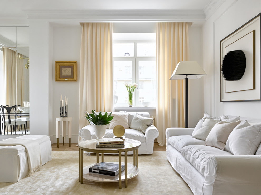 The white color of the walls in the interior looks great in combination with calm beige and luxurious gold, giving sophistication to the living room or bedroom.