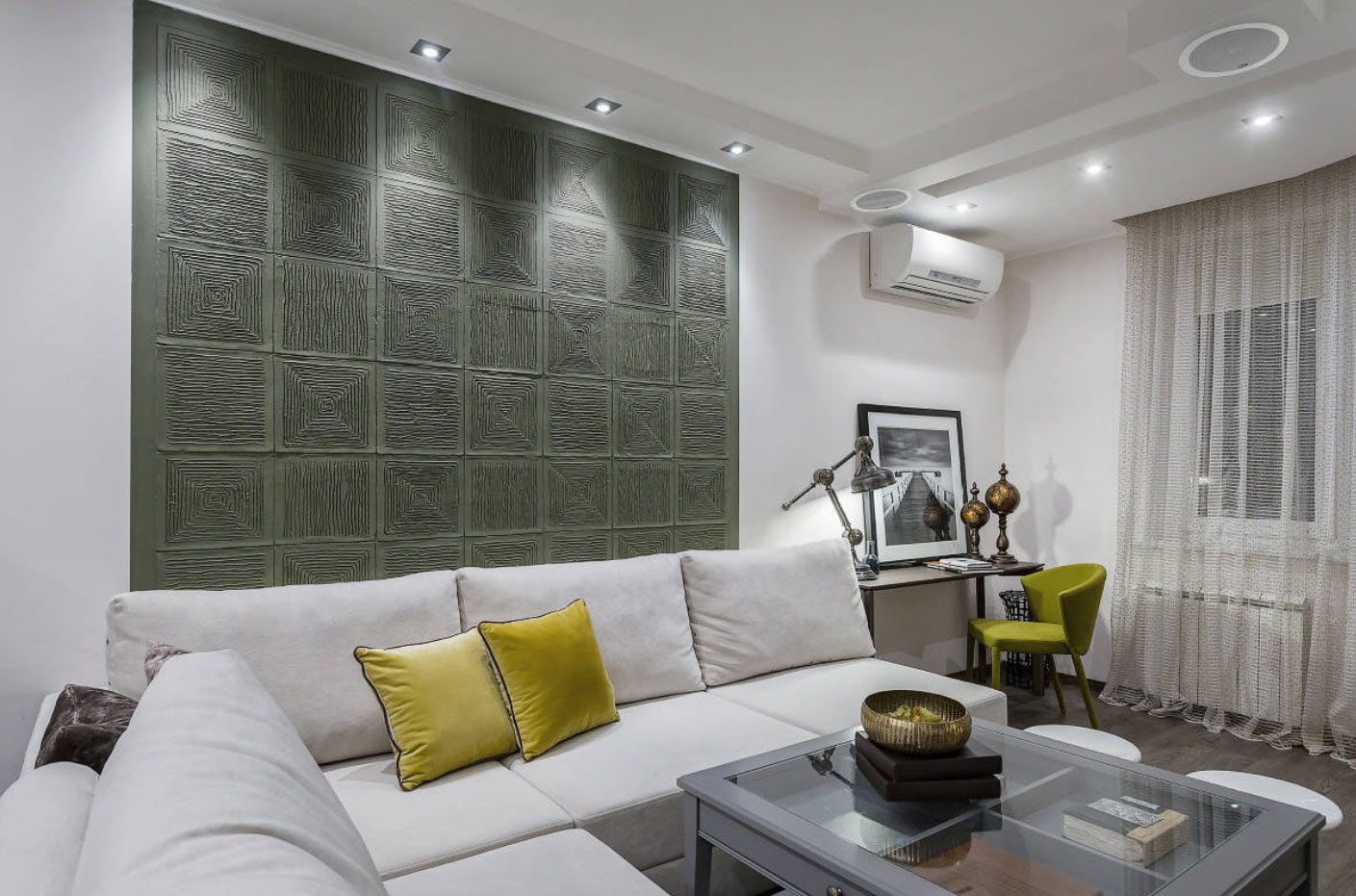 - The emphasis on one wall in the interior visually corrects the room and neutralizes its shortcomings - a narrow room will be made wider, a long one - shorter.