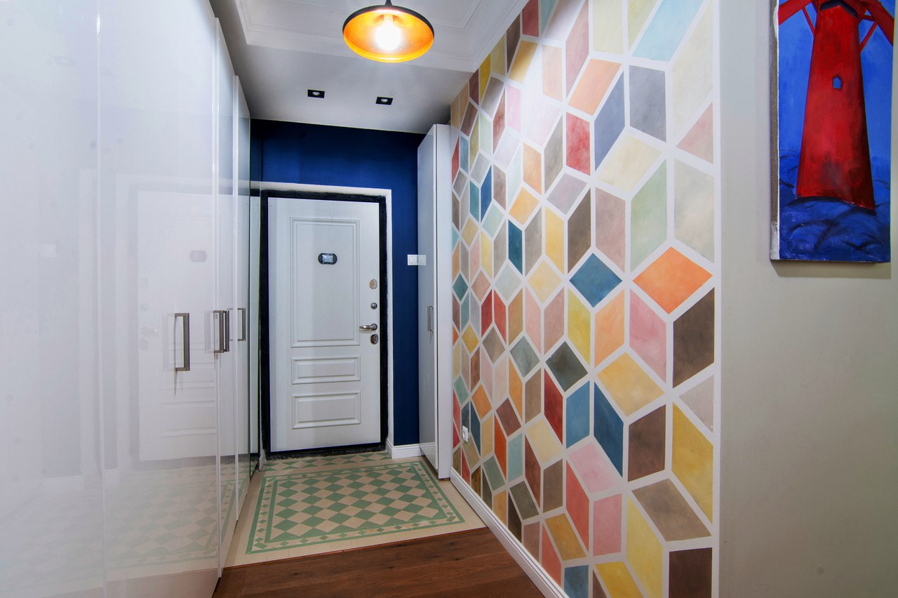 An accent wall in a narrow corridor is placed opposite the door and made darker. Or paint the door itself and everything around it in a deep monochromatic shade. Use paintings and photographs to decorate a long accent wall in the hallway, this will distract from the irregular geometry of the space.