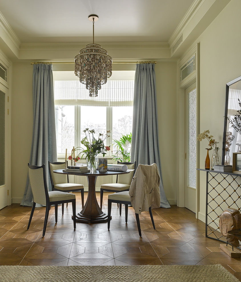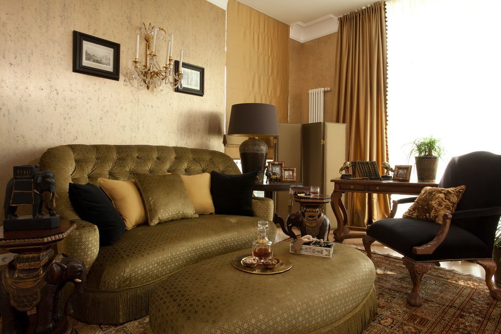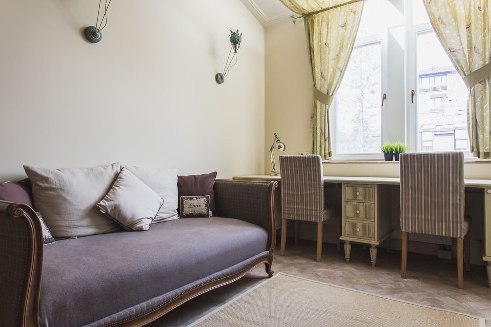 For showiness, furniture upholstery can be bright. The windows are not hung with curtains, revealing a large wooden frame, or straight curtains, roman blinds are used.