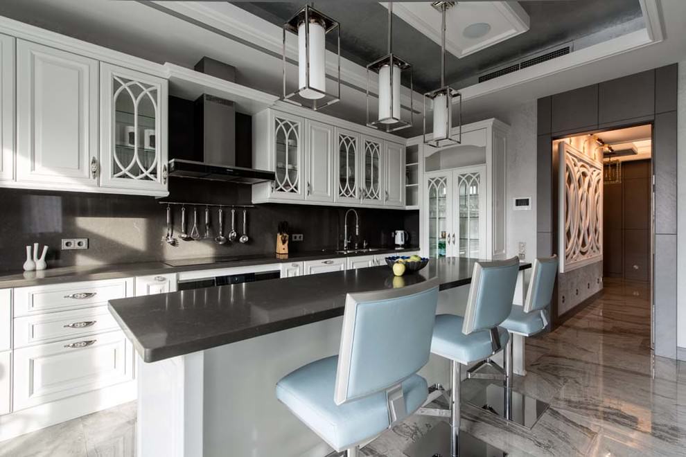 On the picture a corner kitchen in an American style apartment in a stylish gray and white color with a black countertop and a herringbone tile backsplash.
